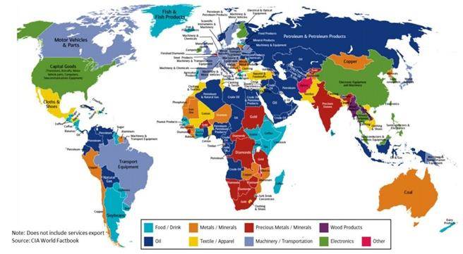 世界各國(guó)的出口商品有哪些?從地圖顏色標(biāo)示中看得一清二楚。(圖/截取美林美銀報(bào)告)