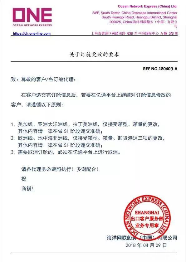 ? ? ? ? 物流巴士獲悉,4月9日,“ONE”船公司發(fā)布了一項關(guān)于訂艙更改的要求通知。